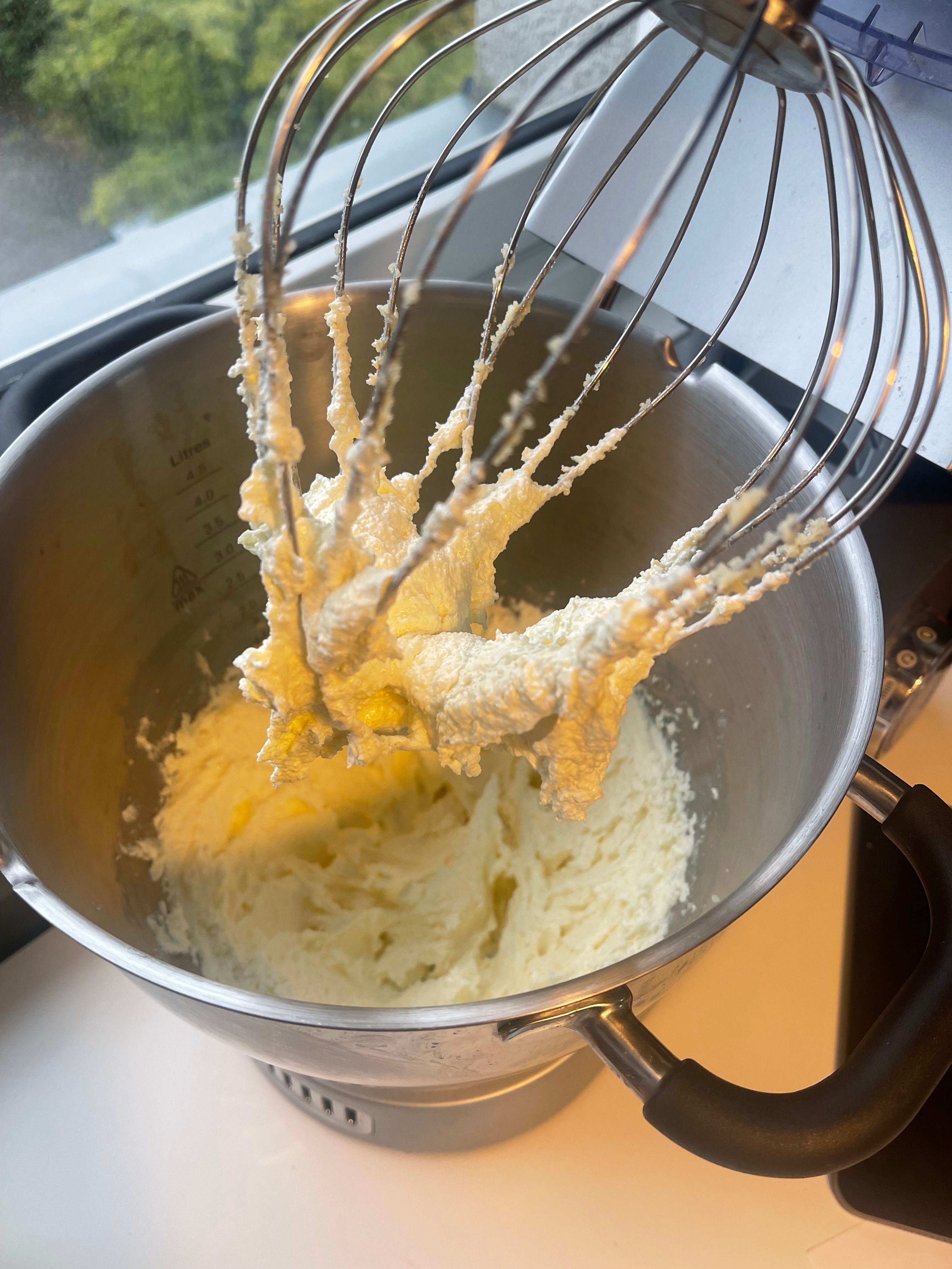 sukker i en kjøkkenmaskin og pisk til den blir lys og fluffy.